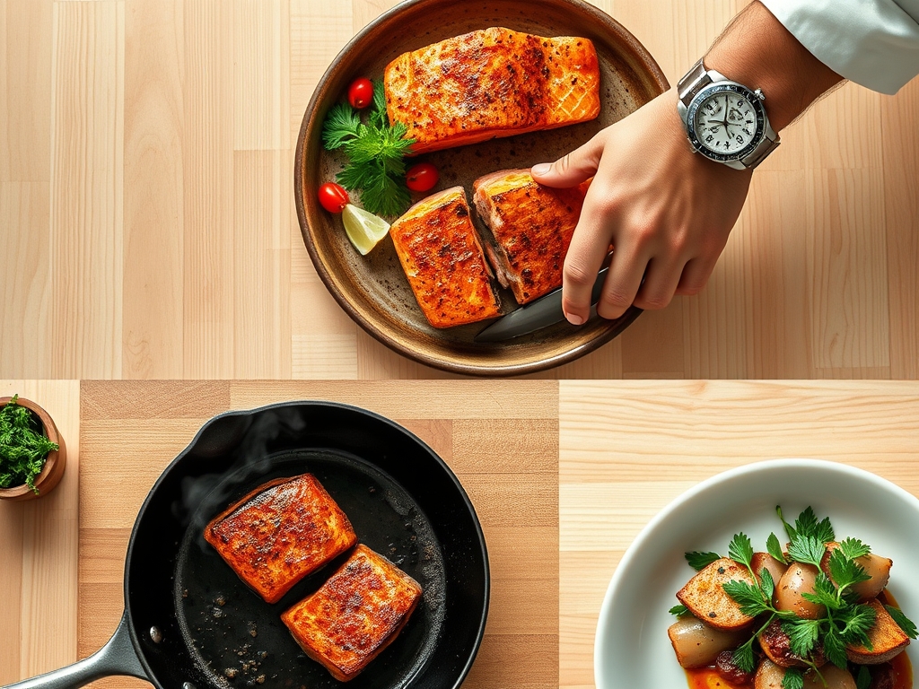 The flow works like this: while the pan preheats, you pat the fish dry. As the first side sears, you prep your aromatics. By the time the fish is resting, you are already whisking a quick pan sauce or plating your greens. This ensures the salmon is served at its peak temperature and texture.
